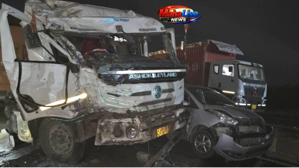 काचेच्या बाटल्या घेऊन जाणारा ट्रक पाळधी जवळ उलटून एकेरी वाहतूक सुरु झाल्यानंतर मागून भरधाव वेगाने येणाऱ्या ट्रकने चार ते पाच वाहनांना धडक दिली.